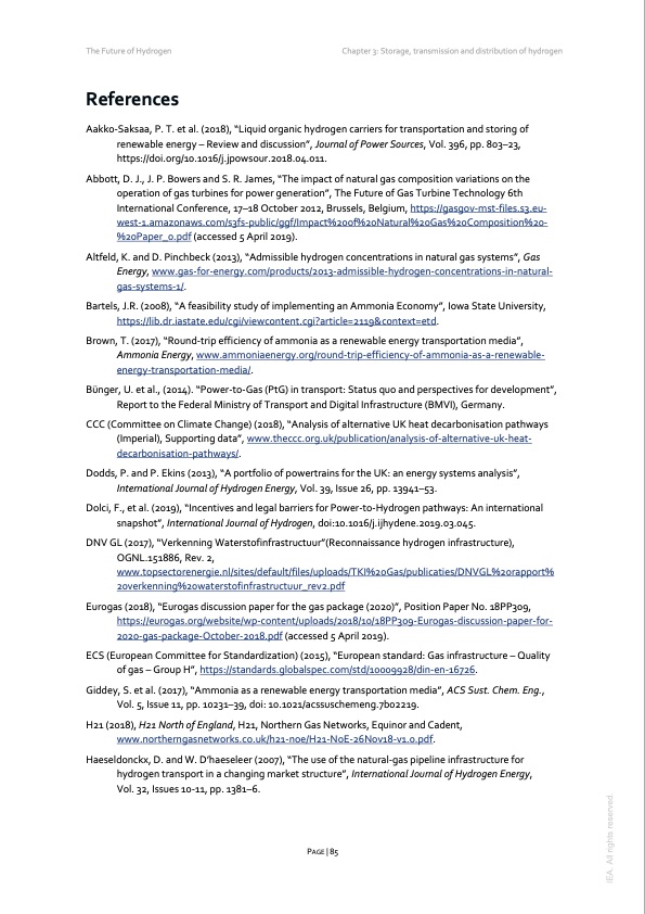 The Future of Hydrogen Chapter 3: Storage, transmission and distribution of hydrogen References Aakko-Saksaa, P. T. et al. (2018), “Liquid organic hydrogen carriers for transportation and storing of renewable energy – Review and discussion”, Journal of Power Sources, Vol. 396, pp. 803–23, https://doi.org/10.1016/j.jpowsour.2018.04.011. Abbott, D. J., J. P. Bowers and S. R. James, “The impact of natural gas composition variations on the operation of gas turbines for power generation”, The Future of Gas Turbine Technology 6th International Conference, 17–18 October 2012, Brussels, Belgium, https://gasgov-mst-files.s3.eu- west-1.amazonaws.com/s3fs-public/ggf/Impact%20of%20Natural%20Gas%20Composition%20- %20Paper_0.pdf (accessed 5 April 2019). Altfeld, K. and D. Pinchbeck (2013), “Admissible hydrogen concentrations in natural gas systems”, Gas Energy, www.gas-for-energy.com/products/2013-admissible-hydrogen-concentrations-in-natural- gas-systems-1/. Bartels, J.R. (2008), “A feasibility study of implementing an Ammonia Economy”, Iowa State University, https://lib.dr.iastate.edu/cgi/viewcontent.cgi?article=2119&context=etd. Brown, T. (2017), “Round-trip efficiency of ammonia as a renewable energy transportation media”, Ammonia Energy, www.ammoniaenergy.org/round-trip-efficiency-of-ammonia-as-a-renewable- energy-transportation-media/. Bünger, U. et al., (2014). “Power-to-Gas (PtG) in transport: Status quo and perspectives for development”, Report to the Federal Ministry of Transport and Digital Infrastructure (BMVI), Germany. CCC (Committee on Climate Change) (2018), “Analysis of alternative UK heat decarbonisation pathways (Imperial), Supporting data”, www.theccc.org.uk/publication/analysis-of-alternative-uk-heat- decarbonisation-pathways/. Dodds, P. and P. Ekins (2013), “A portfolio of powertrains for the UK: an energy systems analysis”, International Journal of Hydrogen Energy, Vol. 39, Issue 26, pp. 13941–53. Dolci, F., et al. (2019), “Incentives and legal barriers for Power-to-Hydrogen pathways: An international snapshot”, International Journal of Hydrogen, doi:10.1016/j.ijhydene.2019.03.045. DNV GL (2017), “Verkenning Waterstofinfrastructuur”(Reconnaissance hydrogen infrastructure), OGNL.151886, Rev. 2, www.topsectorenergie.nl/sites/default/files/uploads/TKI%20Gas/publicaties/DNVGL%20rapport% 20verkenning%20waterstofinfrastructuur_rev2.pdf Eurogas (2018), “Eurogas discussion paper for the gas package (2020)”, Position Paper No. 18PP309, https://eurogas.org/website/wp-content/uploads/2018/10/18PP309-Eurogas-discussion-paper-for- 2020-gas-package-October-2018.pdf (accessed 5 April 2019). ECS (European Committee for Standardization) (2015), “European standard: Gas infrastructure – Quality of gas – Group H”, https://standards.globalspec.com/std/10009928/din-en-16726. Giddey, S. et al. (2017), “Ammonia as a renewable energy transportation media”, ACS Sust. Chem. Eng., Vol. 5, Issue 11, pp. 10231–39, doi: 10.1021/acssuschemeng.7b02219. H21 (2018), H21 North of England, H21, Northern Gas Networks, Equinor and Cadent, www.northerngasnetworks.co.uk/h21-noe/H21-NoE-26Nov18-v1.0.pdf. Haeseldonckx, D. and W. D’haeseleer (2007), “The use of the natural-gas pipeline infrastructure for hydrogen transport in a changing market structure”, International Journal of Hydrogen Energy, Vol. 32, Issues 10-11, pp. 1381–6. PAGE | 85 IEA. All rights reserved.PDF Image | The Future of Hydrogen 2019