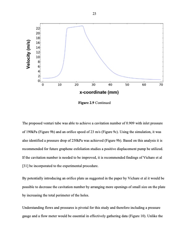 23 Figure 2.9 Continued The proposed venturi tube was able to achieve a cavitation number of 0.909 with inlet pressure of 190kPa (Figure 9b) and an orifice speed of 23 m/s (Figure 9c). Using the simulation, it was also identified a pressure drop of 250kPa was achieved (Figure 9b). Based on this analysis it is recommended for future graphene exfoliation studies a positive displacement pump be utilized. If the cavitation number is needed to be improved, it is recommended findings of Vichare et al [31] be incorporated to the experimental procedure. By potentially introducing an orifice plate as suggested in the paper by Vichare et al it would be possible to decrease the cavitation number by arranging more openings of small size on the plate by increasing the total perimeter of the holes. Understanding flows and pressures is pivotal for this study and therefore including a pressure gauge and a flow meter would be essential in effectively gathering data (Figure 10). Unlike thePDF Image | Hydrodynamic cavitation exfoliation layered graphene nano