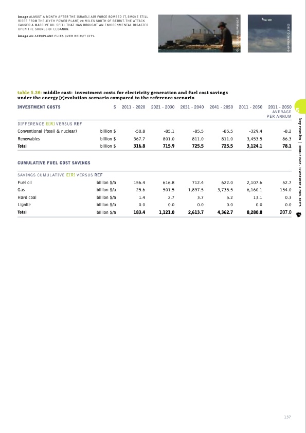 image ALMOST A MONTH AFTER THE ISRAELI AIR FORCE BOMBED IT, SMOKE STILL RISES FROM THE JIYEH POWER PLANT, 20 MILES SOUTH OF BEIRUT. THE ATTACK CAUSED A MASSIVE OIL SPILL THAT HAS BROUGHT AN ENVIRONMENTAL DISASTER UPON THE SHORES OF LEBANON. image AN AEROPLANE FLIES OVER BEIRUT CITY. table 5.36: middle east: investment costs for electricity generation and fuel cost savings under the energy [r]evolution scenario compared to the reference scenario INVESTMENT COSTS DIFFERENCE E[R] VERSUS REF Conventional (fossil & nuclear) Renewables Total CUMULATIVE FUEL COST SAVINGS $ billion $ billion $ billion $ 2011 - 2020 -50.8 367.7 316.8 156.4 25.6 1.4 0.0 183.4 2021 - 2030 -85.1 801.0 715.9 616.8 501.5 2.7 0.0 1,121.0 2031 - 2040 -85.5 811.0 725.5 712.4 1,897.5 3.7 0.0 2,613.7 2041 - 2050 -85.5 811.0 725.5 622.0 3,735.5 5.2 0.0 4,362.7 2011 - 2050 -329.4 3,453.5 3,124.1 2,107.6 6,160.1 13.1 0.0 8,280.8 2011 - 2050 5 AVERAGE PER ANNUM -8.2 86.3 78.1 52.7 154.0 0.3 0.0 207.0 SAVINGS CUMULATIVE E[R] VERSUS REF Fuel oil Gas Hard coal Lignite Total billion $/a billion $/a billion $/a billion $/a billion $/a 137 © J. OERLEMANS/PANOS/GP © GP/PIERRE GLEIZES key results | MIDDLE EAST - INVESTMENT & FUEL COSTSPDF Image | SUSTAINABLE WORLD ENERGY OUTLOOK