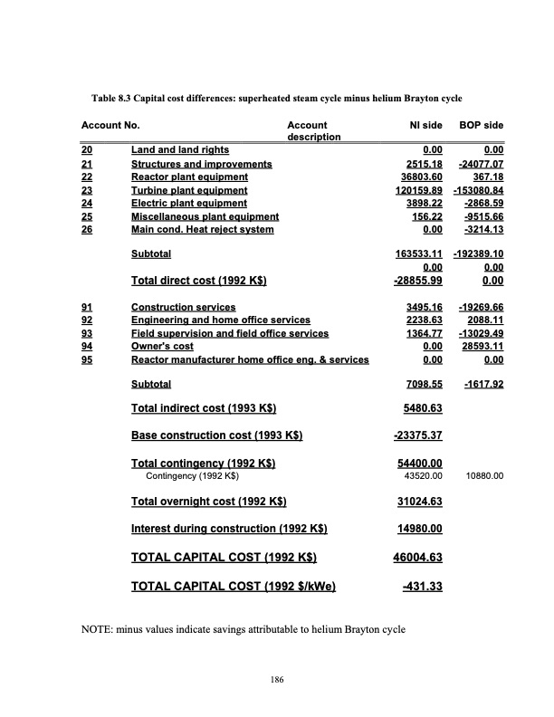 Table 8.3 Capital cost differences: superheated steam cycle minus helium Brayton cycle Account No. 20 Land and land rights 21 Structures and improvements 22 Reactor plant equipment 23 Turbine plant equipment 24 Electric plant equipment 25 Miscellaneous plant equipment 26 Main cond. Heat reject system Subtotal Total direct cost (1992 K$) Account description NI side 0.00 2515.18 36803.60 120159.89 3898.22 156.22 0.00 163533.11 0.00 -28855.99 3495.16 2238.63 1364.77 0.00 0.00 BOP side 0.00 -24077.07 367.18 -153080.84 -2868.59 -9515.66 -3214.13 -192389.10 0.00 0.00 -19269.66 2088.11 -13029.49 28593.11 0.00 -1617.92 10880.00 91 Construction services 92 Engineering and home office services 93 Field supervision and field office services 94 Owner's cost 95 Reactor manufacturer home office eng. & services Subtotal 7098.55 Total indirect cost (1993 K$) Base construction cost (1993 K$) Total contingency (1992 K$) Contingency (1992 K$) Total overnight cost (1992 K$) Interest during construction (1992 K$) TOTAL CAPITAL COST (1992 K$) TOTAL CAPITAL COST (1992 $/kWe) 5480.63 -23375.37 54400.00 43520.00 31024.63 14980.00 46004.63 -431.33 NOTE: minus values indicate savings attributable to helium Brayton cycle 186PDF Image | Supercritical Carbon Dioxide Cycle for Next Generation Nuclear Reactors