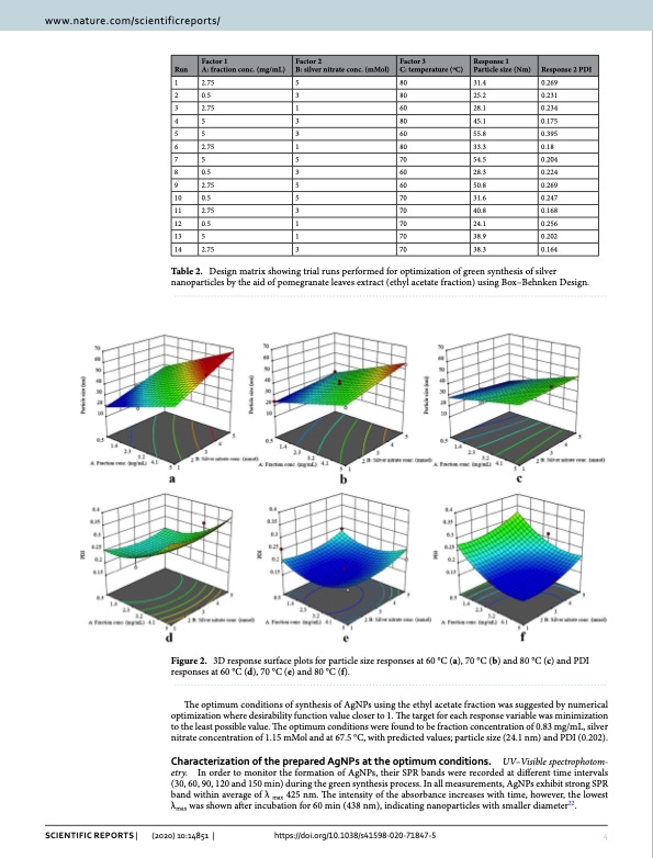 www.nature.com/scientificreports/ Run Factor 1 A: fraction conc. (mg/mL) Factor 2 B: silver nitrate conc. (mMol) Factor 3 C: temperature (oC) Response 1 Particle size (Nm) Response 2 PDI 1 2.75 5 2 0.5 3 3 2.75 1 4 5 3 5 5 3 6 2.75 1 7 5 5 8 0.5 3 9 2.75 5 10 0.5 5 11 2.75 3 12 0.5 1 13 5 1 14 2.75 3 80 31.4 80 25.2 60 28.1 80 45.1 60 55.8 80 33.3 70 54.5 60 28.3 60 50.8 70 31.6 70 40.8 70 24.1 70 38.9 70 38.3 0.269 0.231 0.234 0.175 0.395 0.18 0.204 0.224 0.269 0.247 0.168 0.256 0.202 0.164 Table 2. Design matrix showing trial runs performed for optimization of green synthesis of silver nanoparticles by the aid of pomegranate leaves extract (ethyl acetate fraction) using Box–Behnken Design. Scientific RepoRtS | Vol:.(1234567890) Figure 2. 3D response surface plots for particle size responses at 60 °C (a), 70 °C (b) and 80 °C (c) and PDI responses at 60 °C (d), 70 °C (e) and 80 °C (f). The optimum conditions of synthesis of AgNPs using the ethyl acetate fraction was suggested by numerical optimization where desirability function value closer to 1. The target for each response variable was minimization to the least possible value. The optimum conditions were found to be fraction concentration of 0.83 mg/mL, silver nitrate concentration of 1.15 mMol and at 67.5 °C, with predicted values; particle size (24.1 nm) and PDI (0.202). Characterization of the prepared AgNPs at the optimum conditions. UV–Visible spectrophotom- etry. In order to monitor the formation of AgNPs, their SPR bands were recorded at different time intervals (30, 60, 90, 120 and 150 min) during the green synthesis process. In all measurements, AgNPs exhibit strong SPR band within average of λ max 425 nm. The intensity of the absorbance increases with time, however, the lowest λmax was shown after incubation for 60 min (438 nm), indicating nanoparticles with smaller diameter22. (2020) 10:14851 | https://doi.org/10.1038/s41598-020-71847-5 4PDF Image | pomegranate leaves and their role in green silver nanoparticles